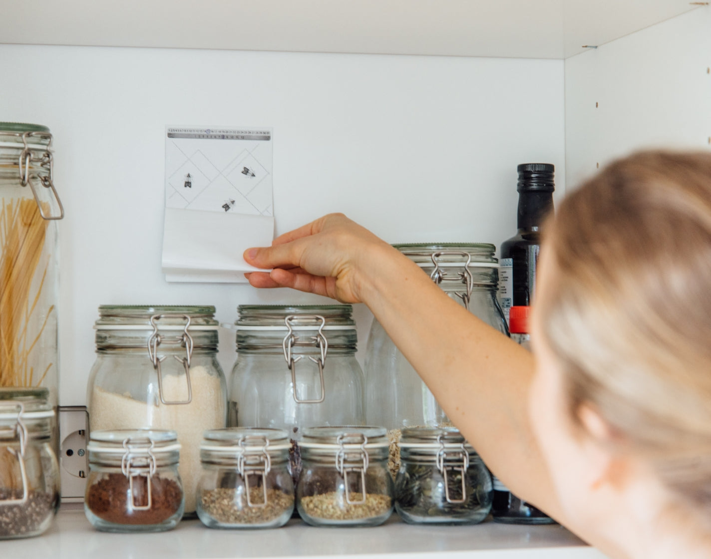 • Bei Lebensmittelmotten: Untersuche deine Vorräte auf Mottenlarven und -gespinste, entsorge alle betroffenen Lebensmittel und stelle sicher, dass deine Lebensmittel im Idealfall luftdicht verpackt sind (z.B. durch Schraubgläser). Tipp: Auch Tierfutter kann betroffen sein.