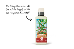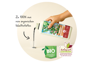 Zunächst sollte die Düngerflasche gut geschüttelt werden. Nehmen Sie die Dosierkappe vom Deckel des Düngers ab und verwenden Sie sie, um 15 bis 25 ml Flüssigdünger auf 5 L Gießwasser abzumessen. Mit der Dünger-Wasser-Mischung können Ihre Pflanzen nun wie gewohnt gegossen werden.