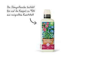 Schütteln Sie die Düngerflasche vor der Anwendung gut. Dann wird die Dosierkappe abgenommen und verwendet, um 15 bis 25 ml Bio-Rhododendrondünger pro 5 L Gießwasser abzumessen. Geben Sie den abgemessenen Dünger in eine Gießkanne und wässern Sie Ihre Pflanzen wie gewohnt mit der Mischung.