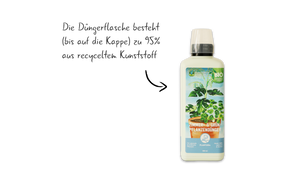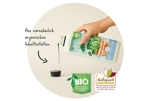 Schütteln Sie die Düngerflasche vor der Verwendung gut. Zur Abmessung der korrekten Düngermenge können Sie die praktische Dosierkappe verwenden. Geben Sie 15 bis 25 ml des Bio-Flüssigdüngers in 5 L Gießwasser. Bei kleineren Gießkannen reicht eine Menge von 3 bis 5 ml Dünger für 1 L Wasser. Anschließend gießen Sie Ihre Pflanzen wie gewohnt. Die Nährstoffe gelangen so direkt an die Wurzeln der Pflanzen und können schnell aufgenommen werden.
