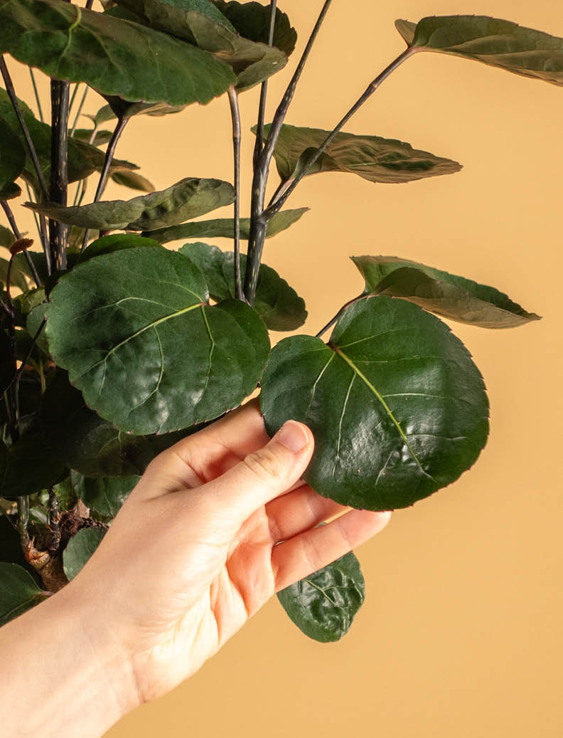• Person mit großer Polyscias scutellaria im Wohnzimmer