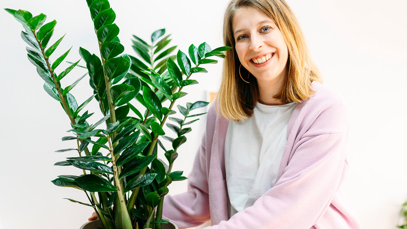 Es reicht, der Zamioculcas kleine Mengen an Wasser zu geben und die Erde dazwischen antrocknen zu lassen. Generell gilt bei der Glücksfeder: Besser zu wenig als zu viel gießen. Gedüngt werden sollte sie zwischen März und Oktober nur einmal im Monat – am besten mit einem Flüssigdünger. Unser vornehmlich organischer Plantura Bio-Zimmer- & Grünpflanzendünger eignet sich hier hervorragend, da er alle wichtigen Nährstoffe enthält. Wusstest du, dass sich die Zamioculcas zum Licht dreht? Deshalb gehört es zur Pflege, sie regelmäßig zu drehen, damit sie gleichmäßig wachsen kann.
