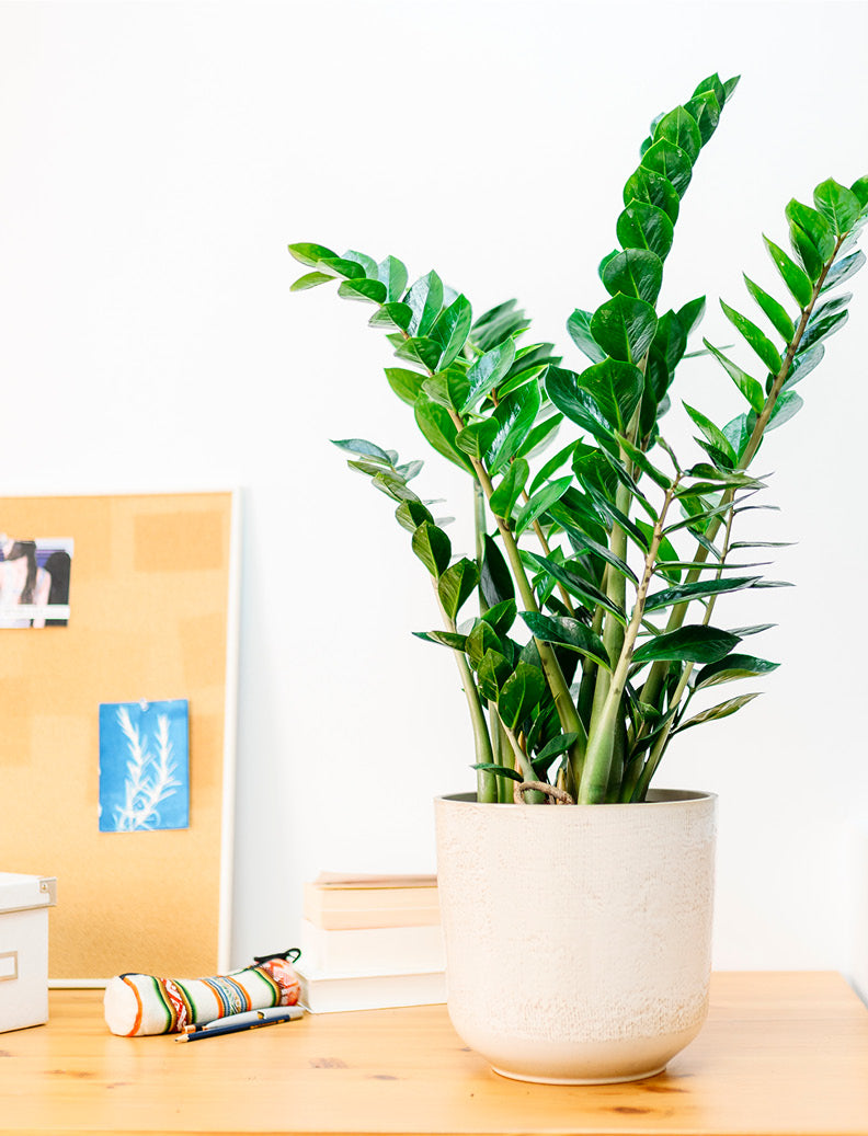 Die Glücksfeder ist die perfekte Mitbewohnerin für Einsteiger. Sie ist völlig unkompliziert in ihrer Pflege und überzeugt mit ihren aufrechten, langen Stielen und wasserspeichernden, grün-glänzenden Blättern. Ursprünglich stammt die schöne Zamioculcas zamiifolia aus warmen Bereichen der Welt wie Sansibar, Kenia und Madagaskar. Ihrer Heimat hat sie ihre robusten Eigenschaften zu verdanken – bei uns wächst die pflegeleichte Zimmerpflanze problemlos in jedem Raum und wird bis zu 1 m groß. Wenn du unsere Glücksfeder kaufst, liefern wir eine kräftige und gesunde Pflanze bequem zu dir nach Hause.