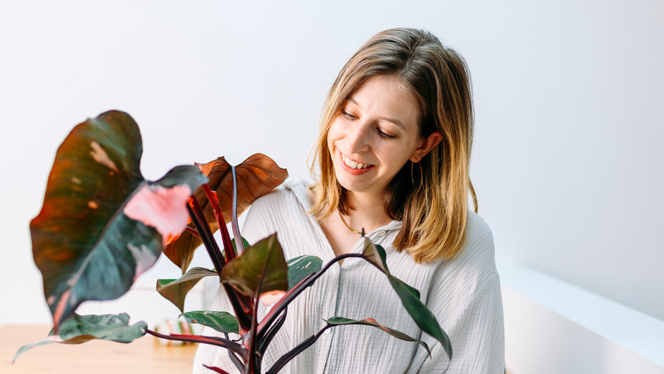 • Frau mit Baumfreund 'Pink Princess' als Zimmerpflanze