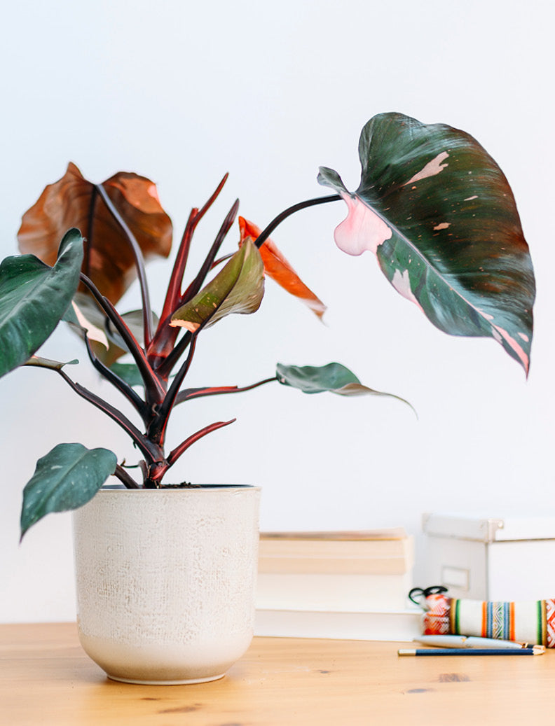 • Philodendron 'Pink Princess' auf dem Schreibtisch
